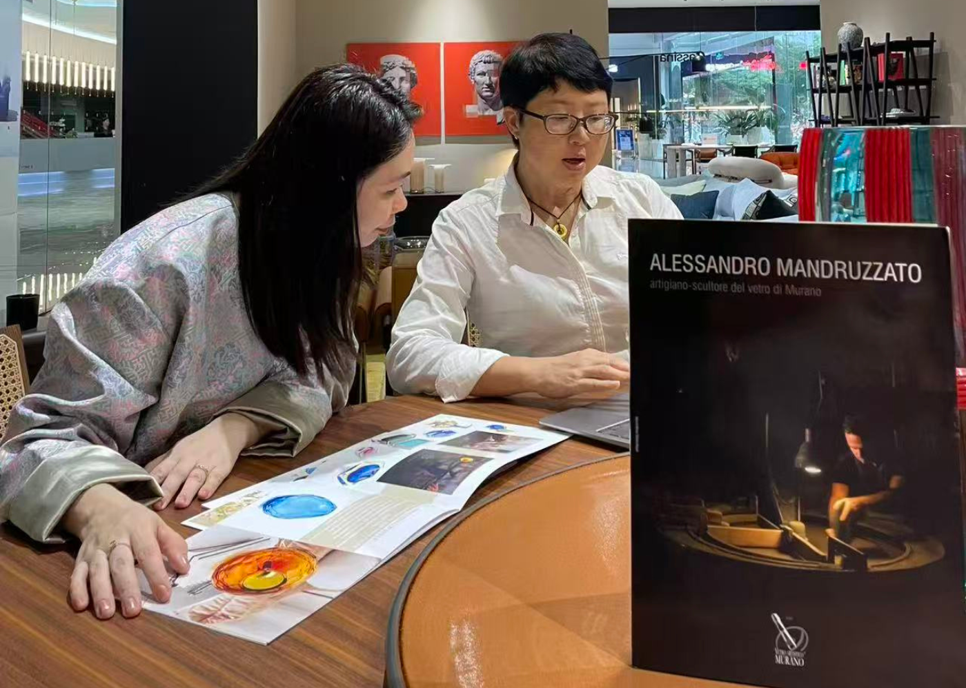 Durante la visita, il nostro team in Cina ha consegnato personalmente una selezione di creazioni in vetro di Murano firmate Alessandro Mandruzzato, destinate a essere esposti nei due showroom Snaidero e Cassina. È stata un’occasione preziosa per raccontare la lunga storia del brand, condividere la visione creativa che guida ogni collezione e valorizzare la tradizione della lavorazione artigianale del vetro di Murano che da sempre contraddistingue il Made in Italy.